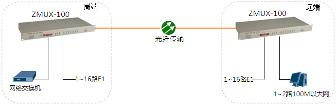 局端站與遠端站間通過光纖點對點通訊。局端站1~16路E1接口(2M接口)及1~2路共享速率100M以太網接入到ZMUX-100后轉換成光信號,再連接上光纖傳輸到對端站還原出來。