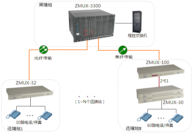 遠端N的ZMUX-30接入60路電話(可選配其它業務)復用成2路E1信號,通過E1接口(2M接口)級聯ZMUX-100,再轉換成光信號,通過光纖傳輸到對端去。