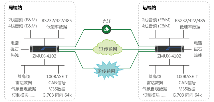 ZMUX-4102 由廣州市銀訊通信科技有限公司自主研發及生產的一款多業務接入與傳輸平臺,可基于IP電路、E1電路、光纖、STM-1/4線路、無線4G、衛星,滿足64K窄帶業務與寬帶數據業務的統一接入、匯聚、交換、傳輸和管理要求,適用于目前IP化與無線傳輸網絡發展趨勢。