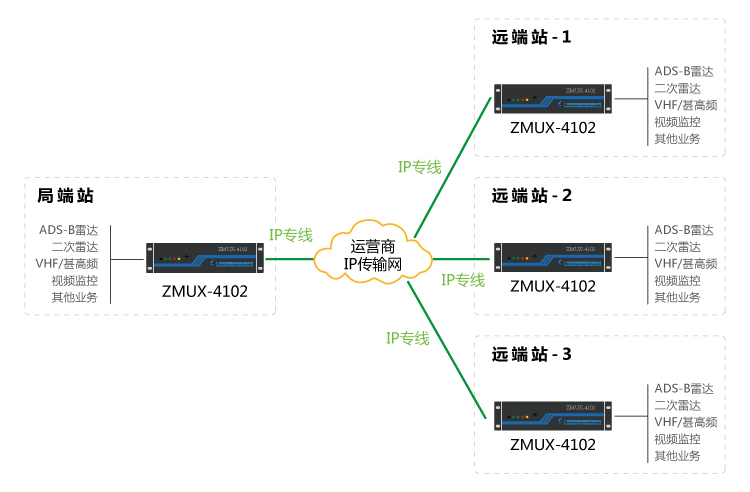 基于IP專線、光纖線路、E1 線路自動切換:遠端站到局端之間,租用運營商IP專線與E1線路、光纖線路,通過接入ZMUX-4102平臺,完成IP專線與E1線、光纖線路自動切換功能,保障甚高頻、雷達數據等業務的安全可靠性傳輸。